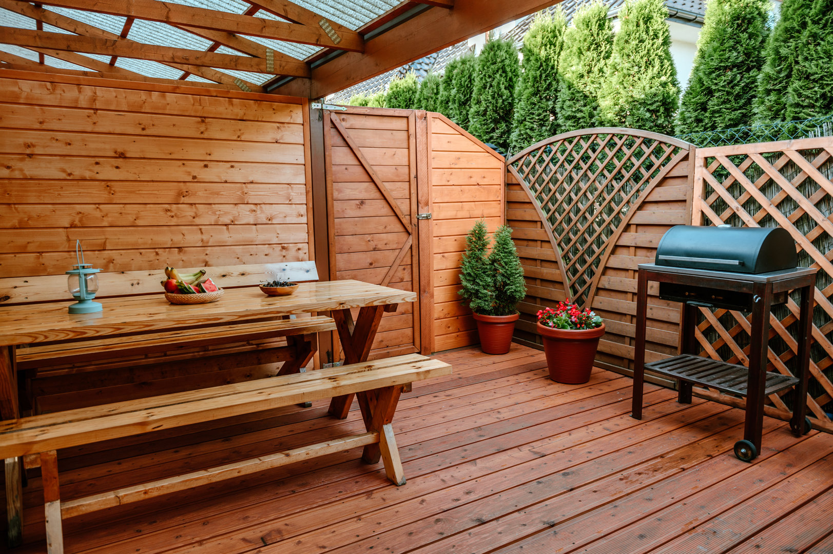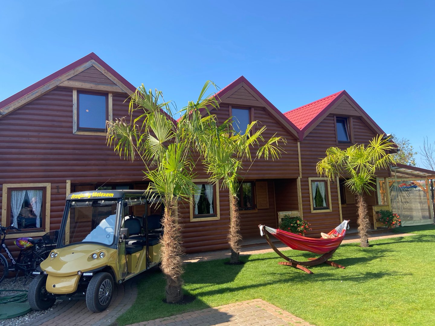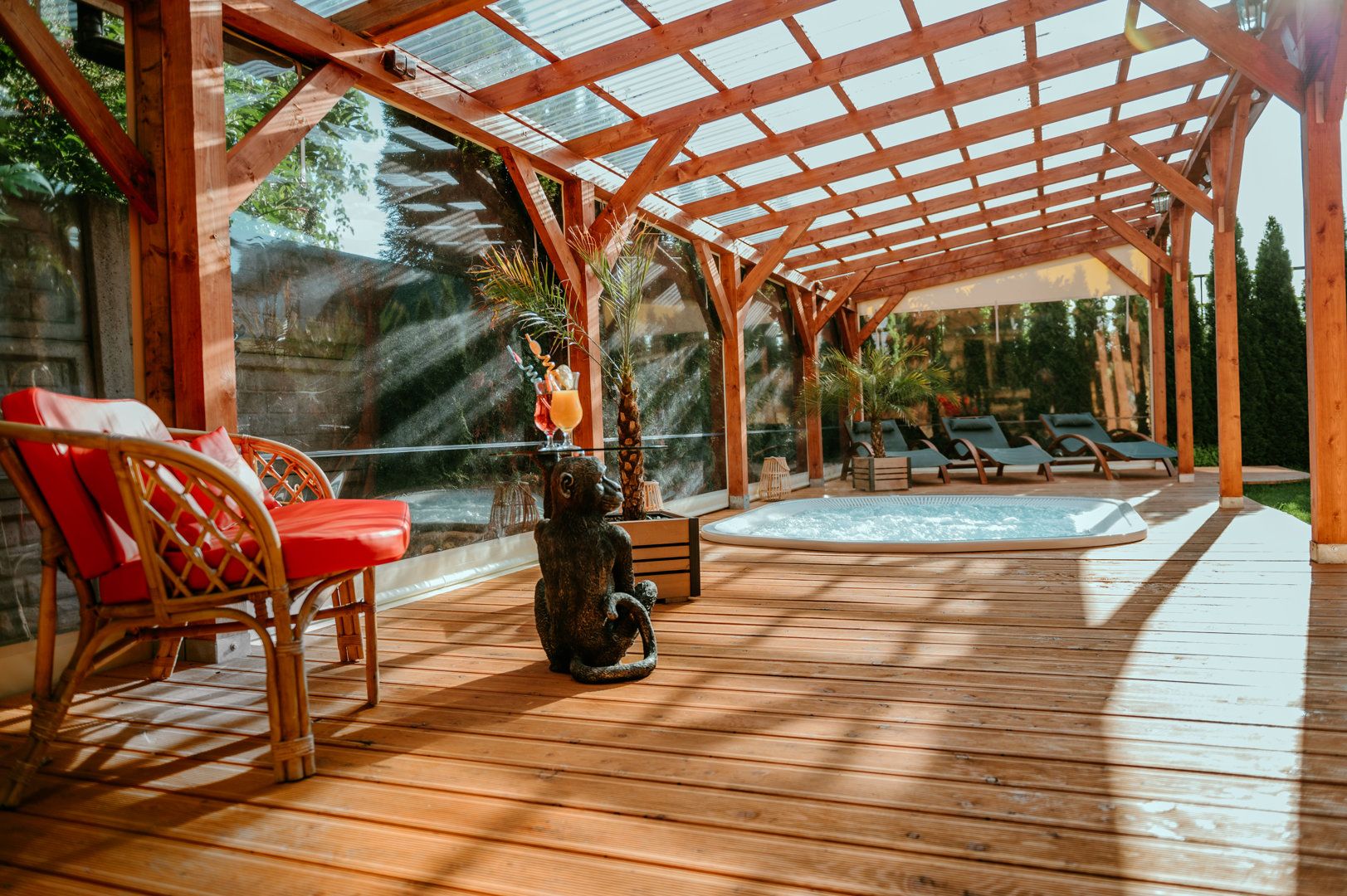Przy każdym domku jest zadaszony i oświetlony taras, wyposażony w meble ogrodowe i grill.